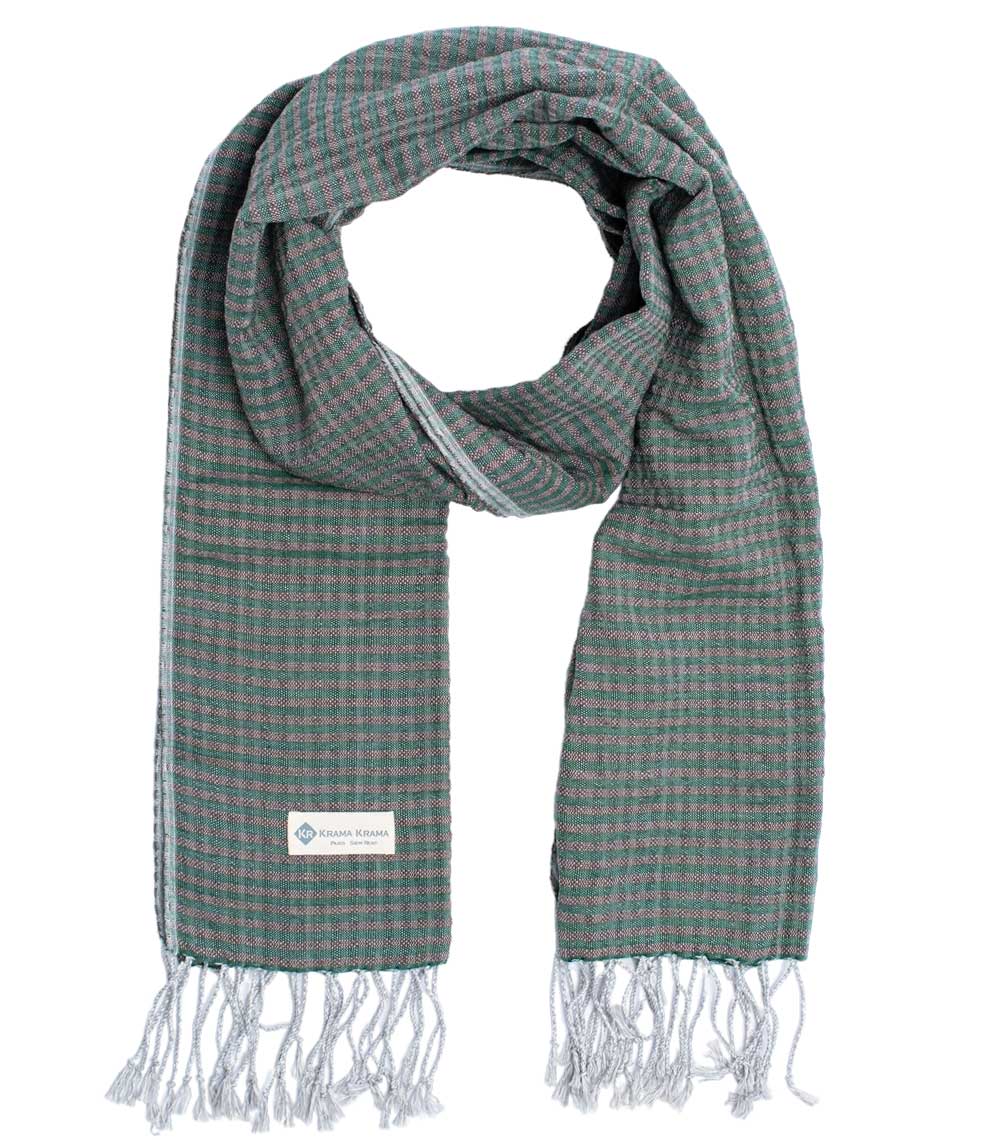 Le foulard krama Baray, aux lignes verticales vertes et grises, présente un maillage dense et apportant une touche sérieuse et sobre à vos tenues classiques ou plus modernes.