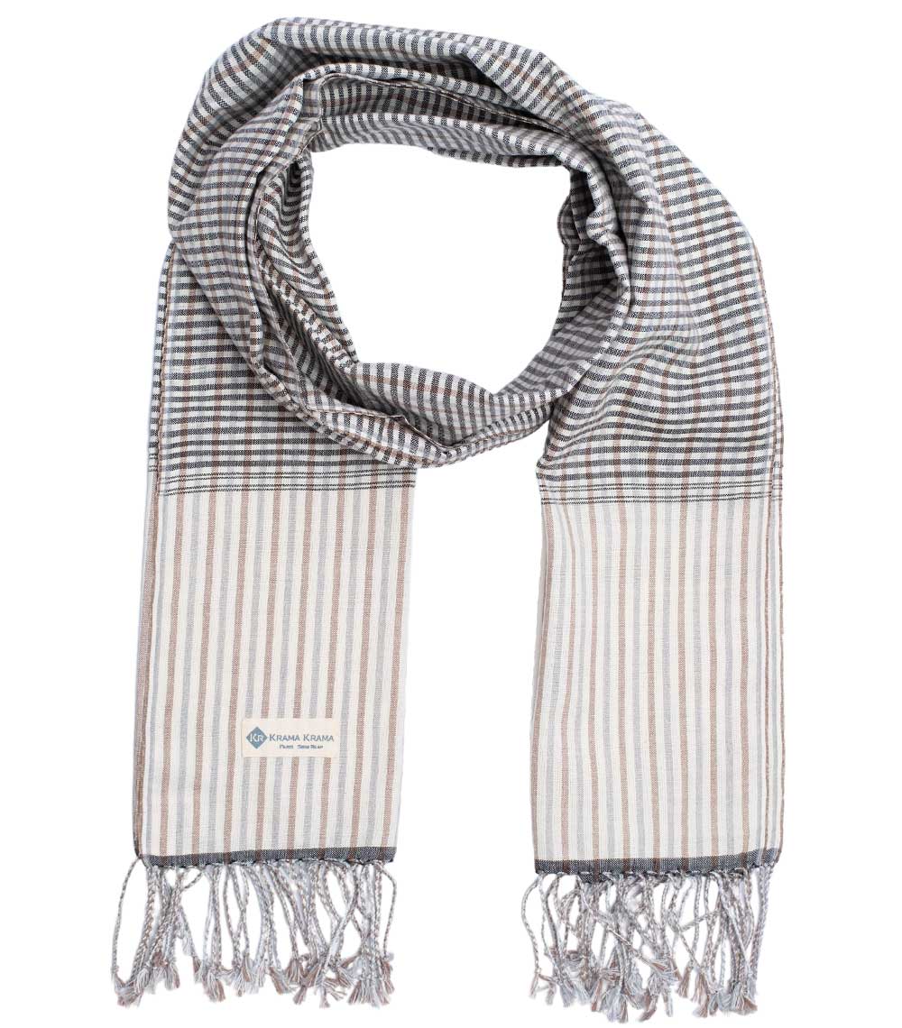 In der Sammlung traditioneller Kramas befindet sich hier das elfenbeinschwarze Krama. Dieser Schal ist das Zusammentreffen von grauen und braunen Linien mit einem horizontalen Farbverlauf aus schwarzem Elfenbein. Ein kambodschanisches Unisex-Kopftuch, das Sie täglich tragen können und das Ihr Ehepartner ungehindert ausleihen wird.