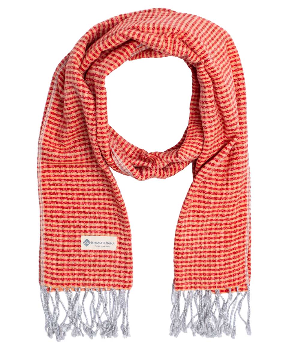 The Sisophon krama is a scarf with vibrant, spicy tones that will warm up your winter wardrobe and make you feel like it's summer again. Tie it around your neck and spice up your look in an original way- all while highlighting your face.
